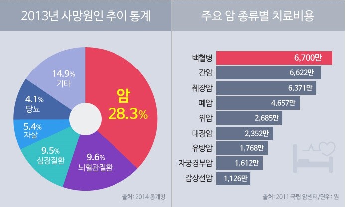 위의 표에서 보시다시피 한국인의 사망원인 1위가 바로 암이랍니다.